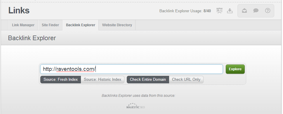 Raven Backlink Explorer uses Majestic data (you shouldn’t just use OSE data) and allows you to chop it up within the tool – handy of you are looking for an overuse of anchor text or figuring out what tactics the competition are using.